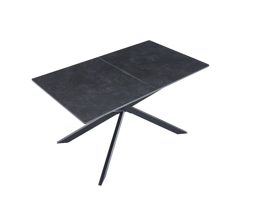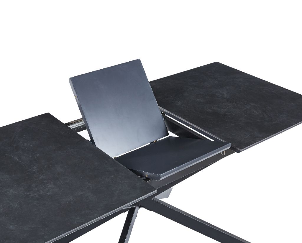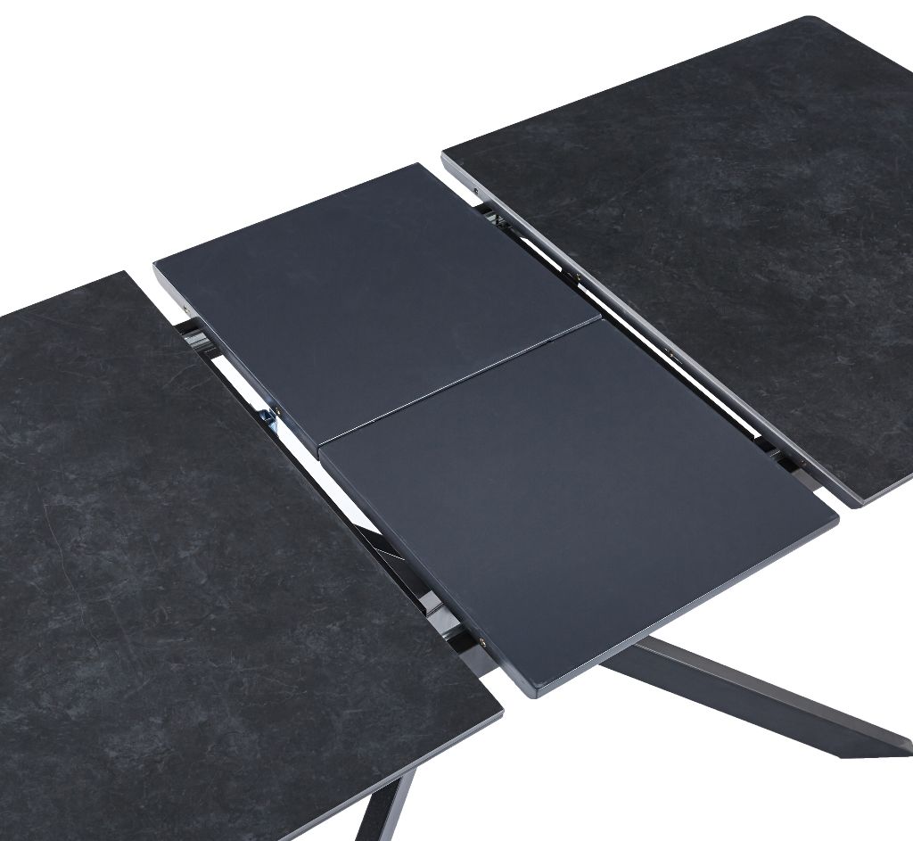 Mesa extensible mediante guias metálicas Ampliación interior tipo libro en color negro Tapa acabado cerámico color negro Tapas metalicas color negro Ancho cerrado 140cm Ancho abierto 180cm Alto 75cm Fondo 80cm