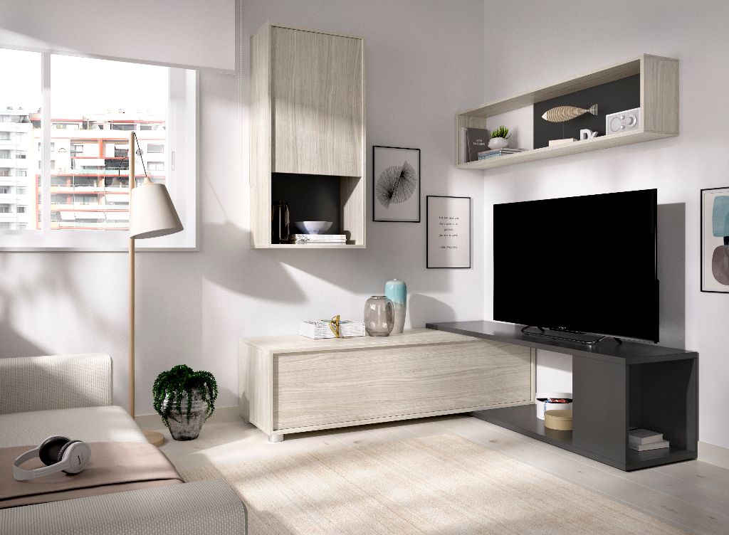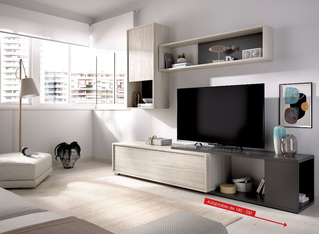 Medidas Mueble Tv MAXIMO 50 PULGADAS 41 cm (alto) x 180/230 cm (ancho) x 41 cm (prof.) Medidas Módulo superior 93 cm (alto) x 45 cm (ancho) x 27 cm (prof.) Medidas Estante de colgar 29 cm (alto) x 120 cm (ancho) x 18 cm (prof.) - Mueble Tv con soporte de hasta 50kg. - Módulo superior con soporte de hasta 12kg. - Estante mural con soporte de hasta 15kg. Mueble de salón/comedor con un estilo joven y moderno compuesto por cuatro módulos flexibles que se adaptan al espacio.