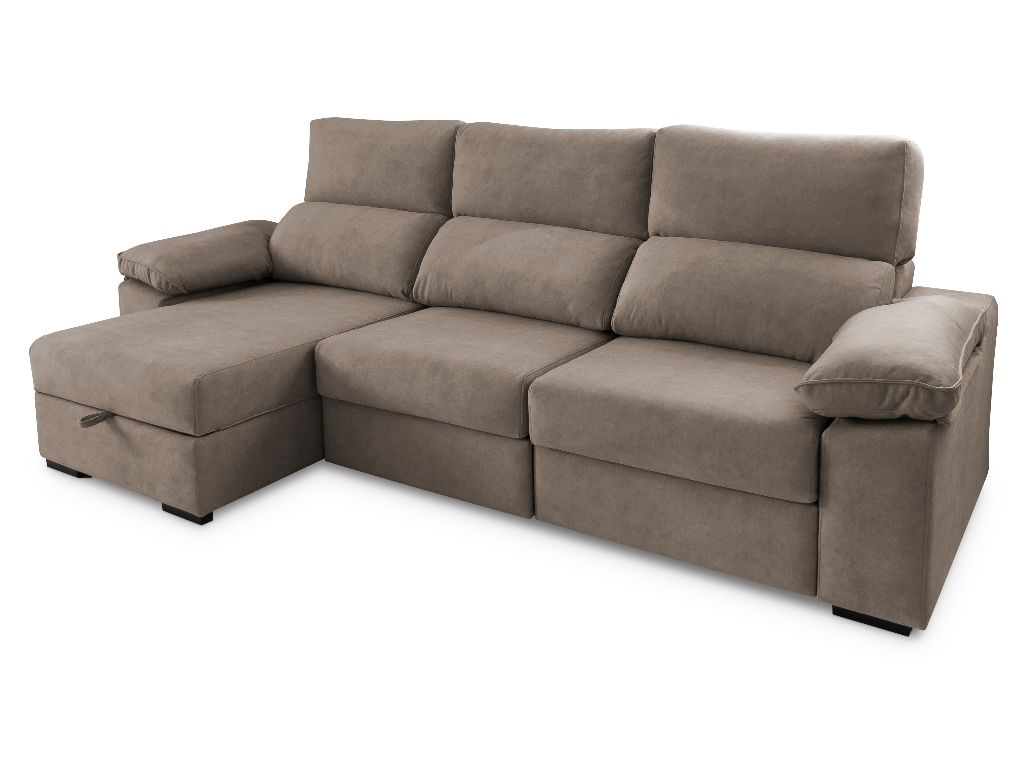 Largo 280cm Alto 110cm Fondo 100cm Fondo Chais 155cm Asiento deslizante de largo recorrido con apoyo al suelo Respaldo reclinable Chais con arcón Tejido Easy Clean
