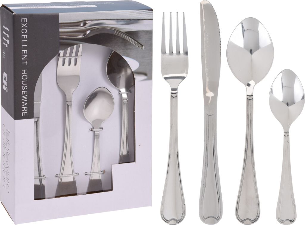 JUEGO DE CUBIERTOS, 16 PIEZAS. ACERO INOXIDABLE 201, CUCHILLO 430. PESO 550 GRAMOS. 4 x cuchillo de 3,0 mm, acero inoxidable, 4 x piezas de tenedor de 1,5 mm, 4 x piezas de cuchara de 1,5 mm, 4 piezas de cuchara de té de 1,2 mm