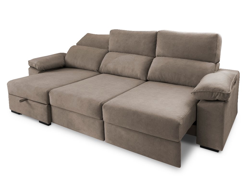 Largo 280cm Alto 110cm Fondo 100cm Fondo Chais 155cm Asiento deslizante de largo recorrido con apoyo al suelo Respaldo reclinable Chais con arcón Tejido Easy Clean