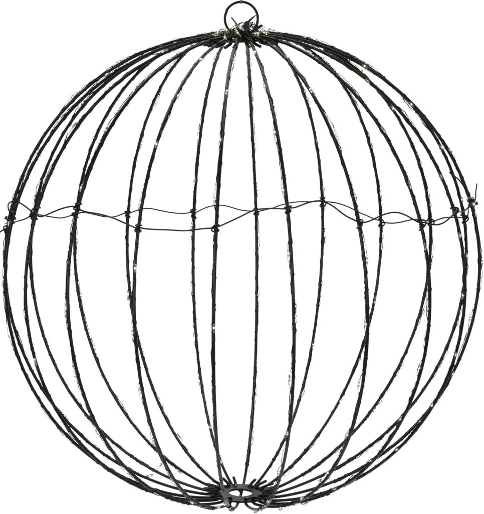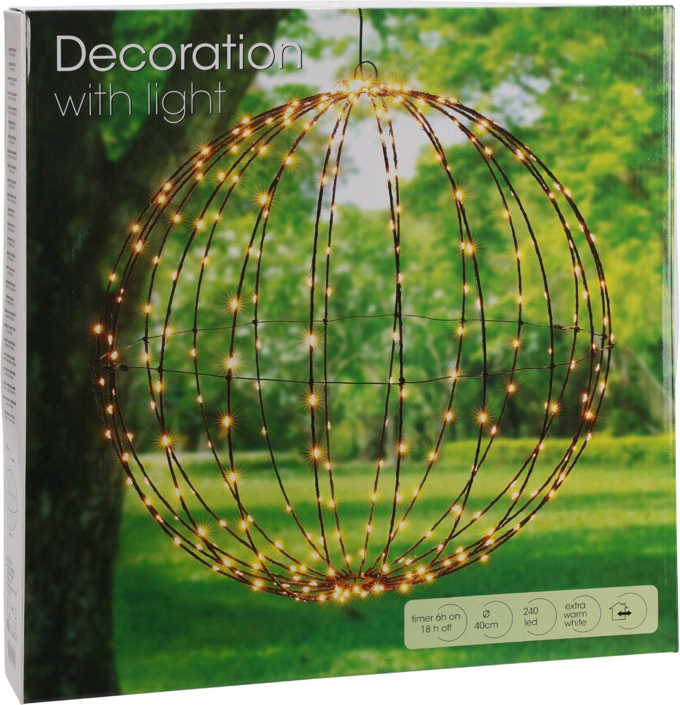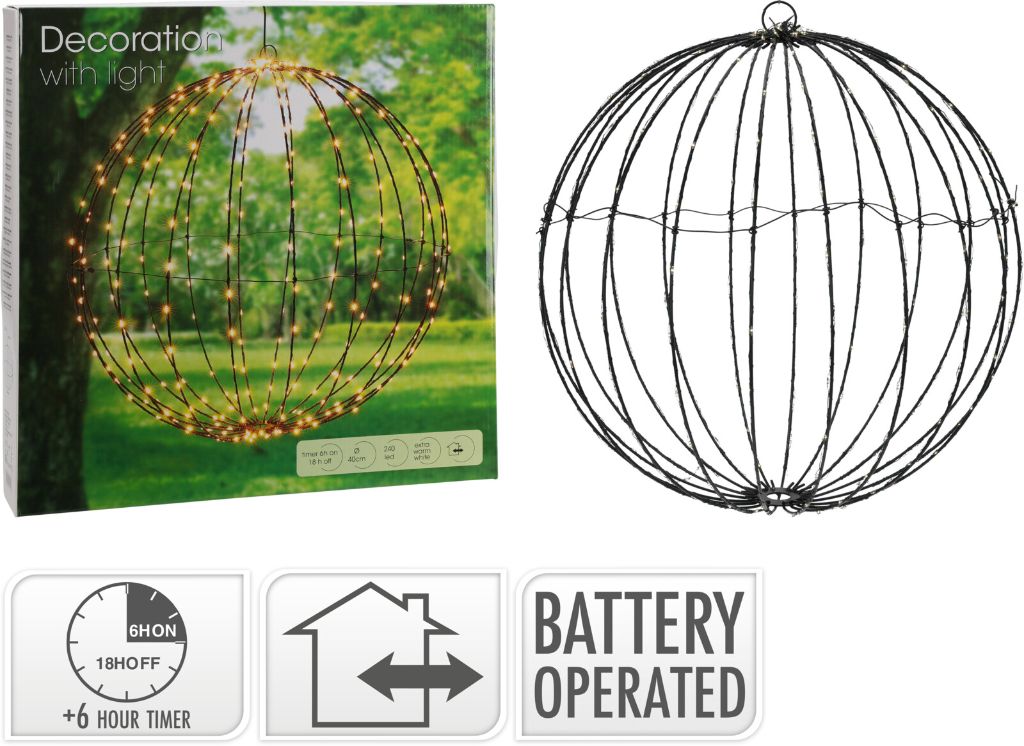 BOLA METÁLICA PLEGABLE, CON 240 LED BLANCO EXTRA CÁLIDO, DIÁMETRO: 40 CM, MARCO DE COLOR: NEGRO, 20 RAMAS CON CADA 12 LED, 5 M CABLE CONDUCTOR NEGRO, ADAPTADOR IP44 CON FUNCIÓN DE TEMPORIZADOR, 6 HORAS DE ENCENDIDO / 18 HORAS DE APAGADO