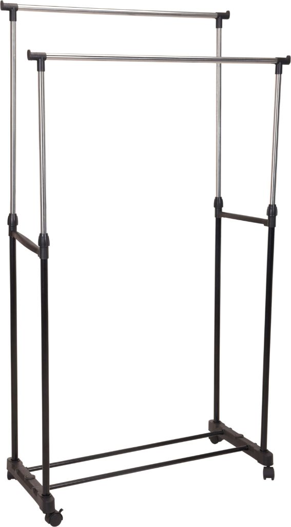 PERCHERO SOBRE 4 RUEDAS, 2 PERCHEROS CON BARRA REFORZADA, ESTRUCTURA METÁLICA, BARRAS SUPERIORES DE ACERO INOXIDABLE DE 19 MM. BARRAS METÁLICAS INFERIORES DE 16 MM, ESPESOR 0,25 MM, COLOR NEGRO, BARRAS DE PROTECCIÓN CROMADAS, PIEZA DE PP EN NEGRO EXTERIOR. TAMAÑO 80X42XH90-160CM.