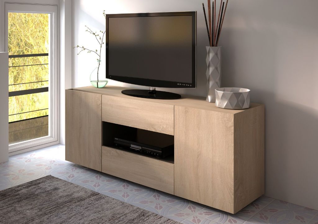 MESA TV ECRIN 2 PUERTAS 2 HUECOS DE 140CM REF. 17086 COLOR ROBLE PATA NEGRO